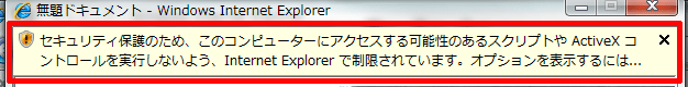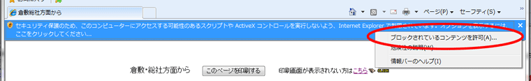 | 印刷画面が表示されない場合 「このページを印刷する」ボタンを押しても、印刷画面が表示されない場合は、下図の赤囲み部分にメッセージが表示されていないか、ご確認ください。 もし、表示されていた場合は、下記の手順にて制限を解除していただければ、印刷画面が表示されることがあります。 |